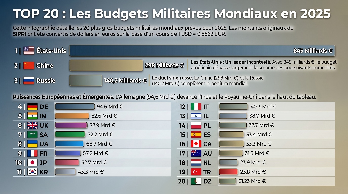 NDLR : les montants du SIPRI étant en dollars, nous avons souhaité donné une estimation en euros en prenant un cours moyen en 2025 à 1 USD = 0,8862 EUR