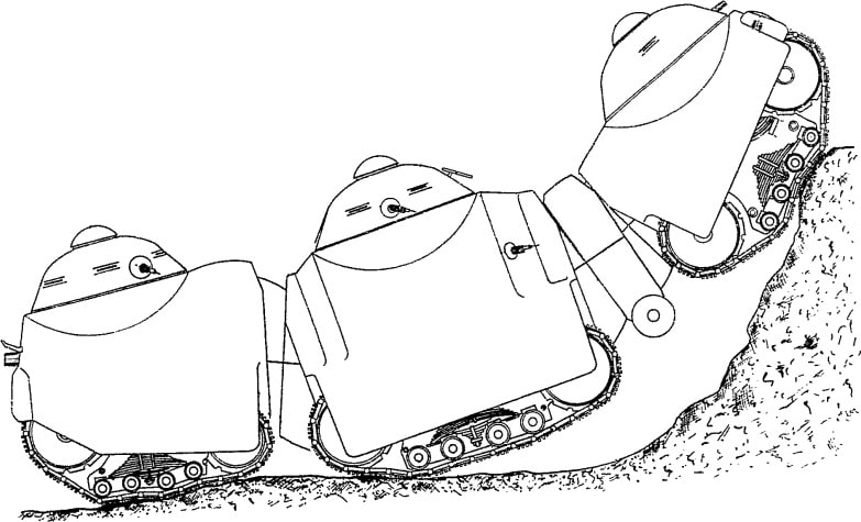Chaque module est équipé de son propre système de chenilles, de suspension, et d’une tourelle. Les cabines sont reliées entre elles par des sphères articulées, agissant comme des genoux mécaniques. Grâce à l’hydraulique, ces articulations peuvent se verrouiller, facilitant le franchissement d’obstacles verticaux ou le passage au-dessus de tranchées.