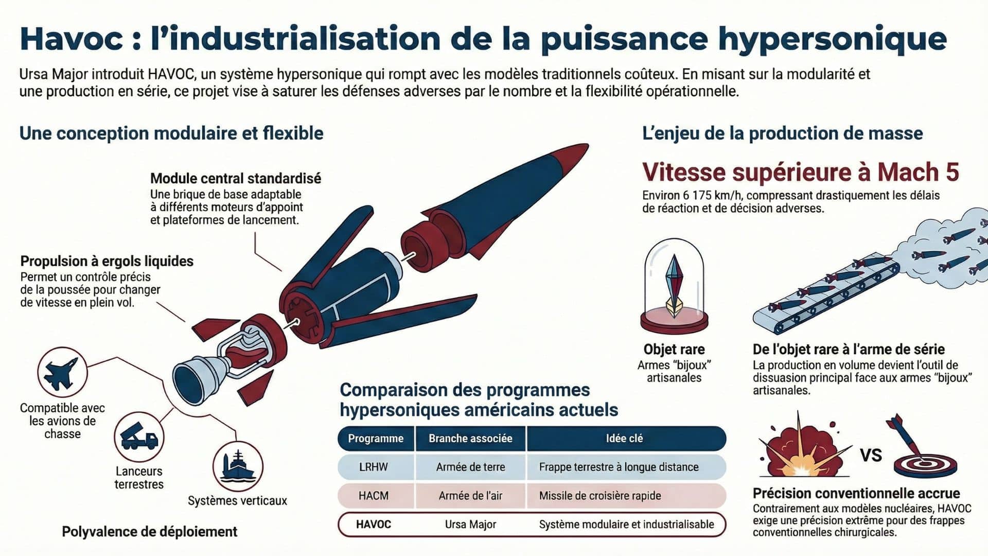 Le PDG d’Ursa Major insiste sur la capacité à produire en quantité. Ce n’est pas un slogan. Une arme rare impressionne, une arme produite en volume dissuade. Si l’hypersonique reste un bijou hors de prix, il ne change pas l’équation d’une guerre longue. Si, au contraire, il devient industrialisable, il force l’adversaire à dépenser en défenses, en capteurs, en intercepteurs, et en dispersion. C’est là que HAVOC se place : une approche “moins exotique, plus livrable”. La vraie question n’est pas seulement “est-ce que ça va vite ?”, mais “combien d’unités peuvent être livrées, à quel rythme, et avec quelle fiabilité ?”. Autrement dit, série plus cadence.
