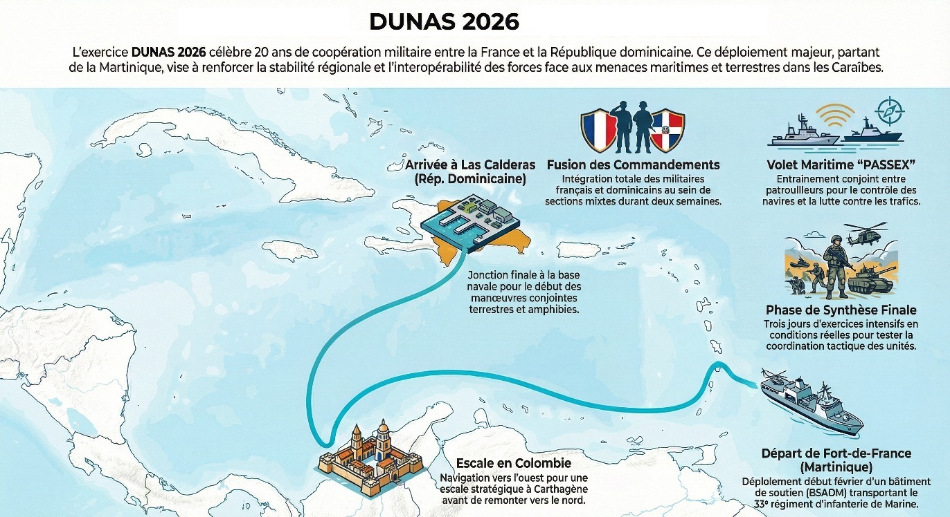 Du 23 février au 20 mars 2026, les forces françaises avaient pris un rendez-vous essentiel pour la présence française dans les Antilles avec l’exercice DUNAS. Une édition particulière, puisqu’elle marquait vingt années de coopération militaire entre la France et la République dominicaine.