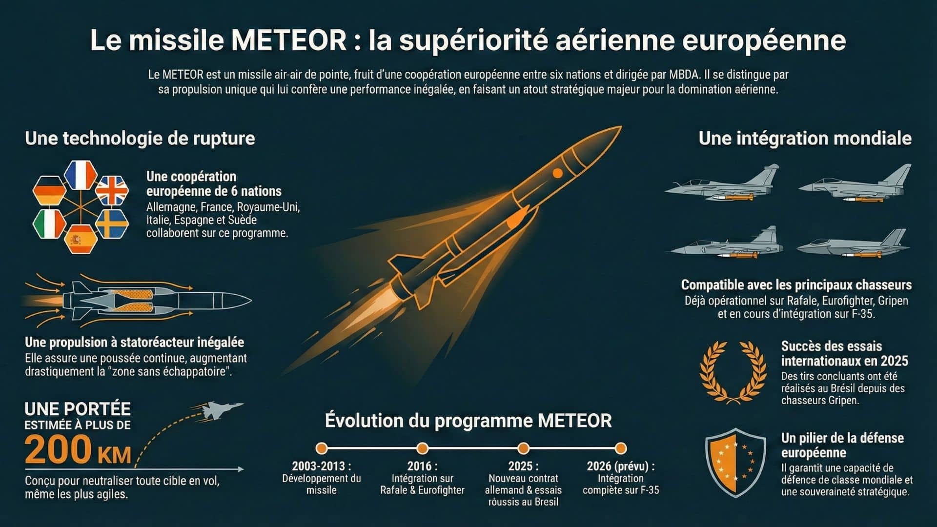 Le missile METEOR incarne ce que l’Europe sait encore faire de mieux en matière de technologie militaire. Conçu par MBDA, ce programme regroupe six nations partenaires : Allemagne, France, Royaume-Uni, Italie, Espagne et Suède. Chaque pays apporte son expertise. En 2025, l’Allemagne a décidé d’aller plus loin en signant un nouveau contrat via le BAAINBw, renforçant ainsi un partenariat déjà stratégique.