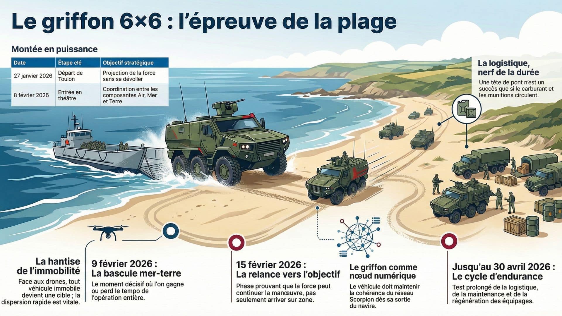 | 9 février 2026 | Débarquement des Griffon 6×6 | Bascule mer-terre | Le moment où l’on perd le tempo… ou où l’on le gagne |
