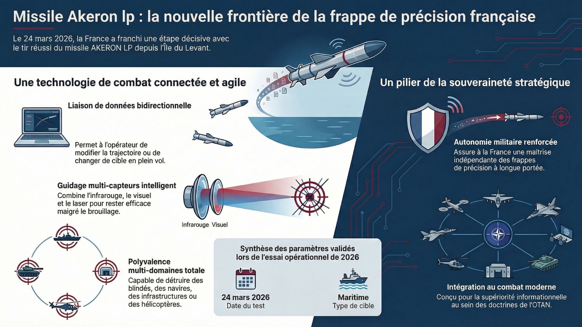 Le 24 mars 2026, un tir discret mais stratégique a eu lieu sur l’Île du Levant. Un prototype du missile AKERON LP a été lancé contre une cible maritime pour tester ses fonctions critiques. Derrière cette démonstration, il ne s’agit pas d’un simple essai technique mais d’un signal clair envoyé sur les capacités françaises. La France avance vers une arme capable de s’intégrer dans une guerre moderne connectée, rapide et multi-domaines.