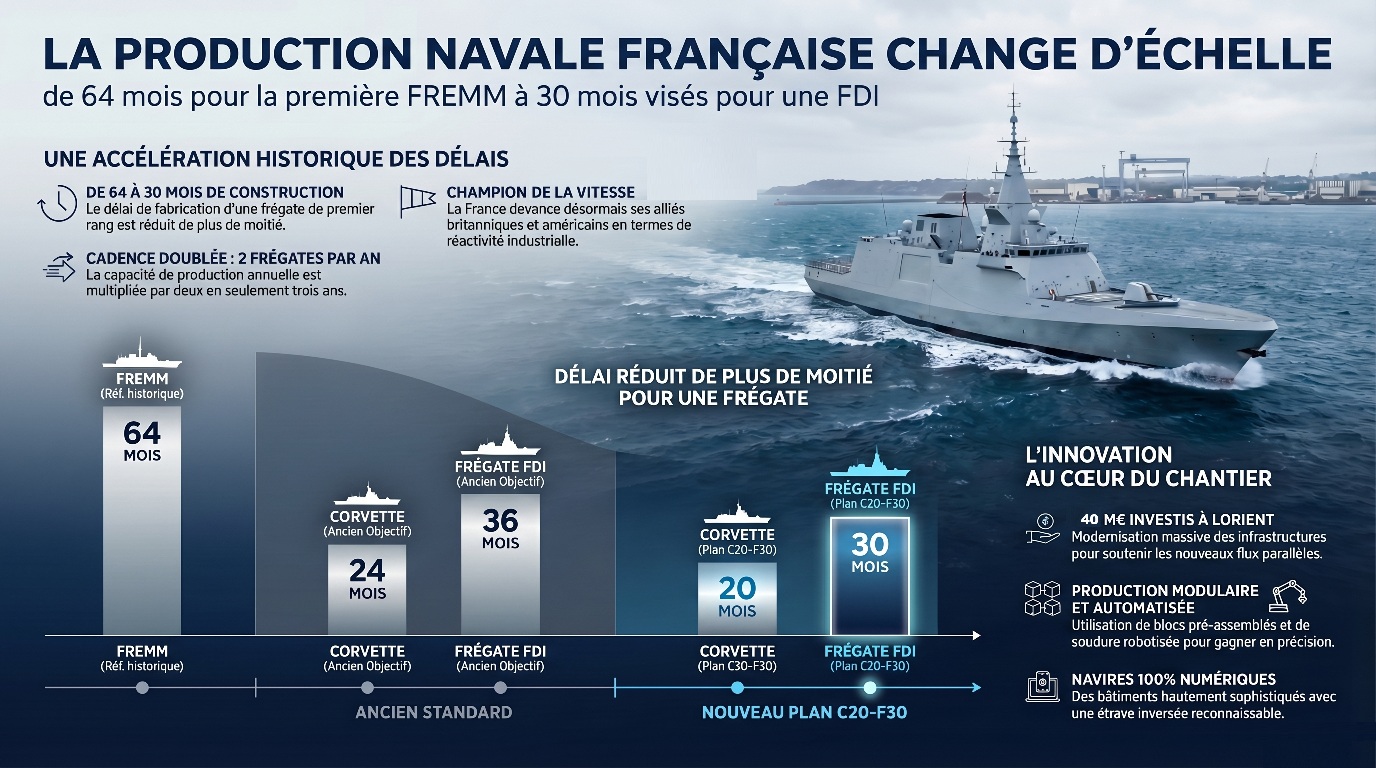L’industriel français a revu complètement ses processus de construction dans le cadre du plan « C20-F30 », l’objectif étant de ramener les délais à 20 mois pour une corvette et 30 mois pour une frégate FDI, contre respectivement 24 et 36 mois auparavant… et jusqu’à 64 mois pour les premières FREMM dans les années 1990.