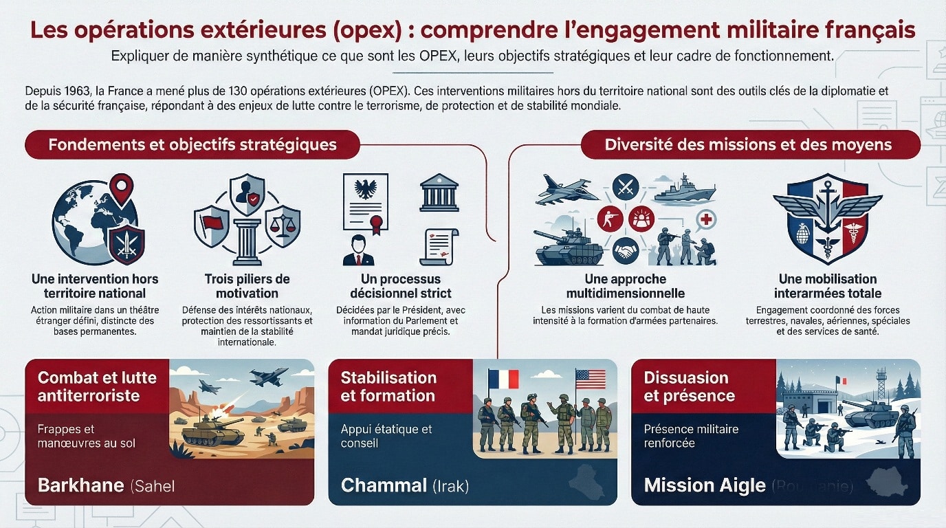 Depuis plus de soixante ans, les opérations extérieures constituent un pilier de l’action militaire française. Qu’il s’agisse de combattre des groupes terroristes, de protéger des populations civiles en danger, de soutenir des États alliés ou de dissuader une agression, ces engagements définissent le quotidien de nos armées et notre rôle sur la scène internationale.