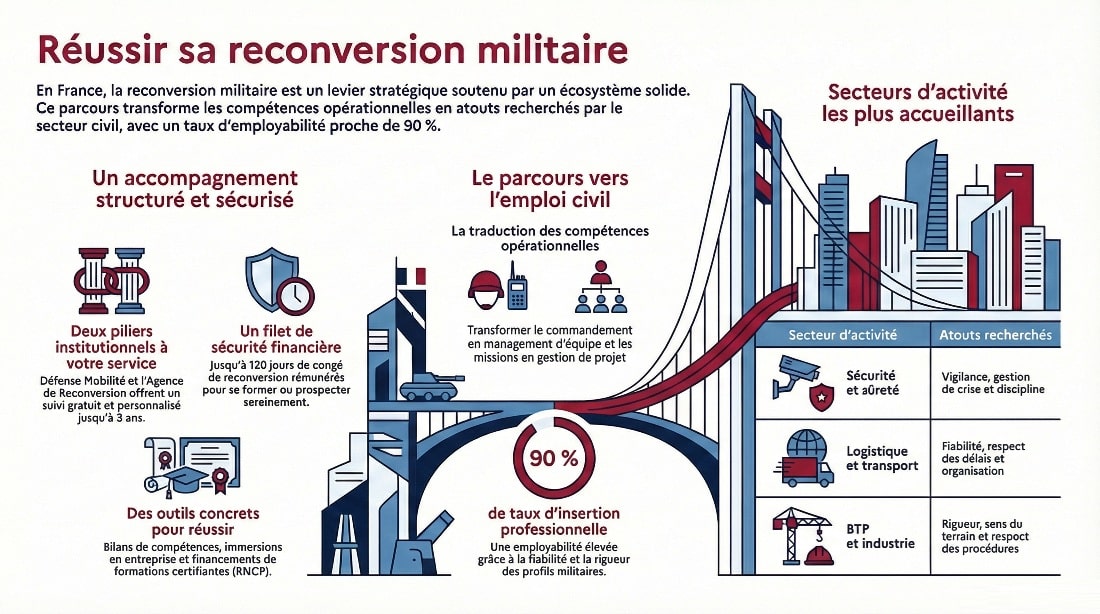 Reconversion des militaires en France : dispositifs, métiers et aides en 2026 - infographie