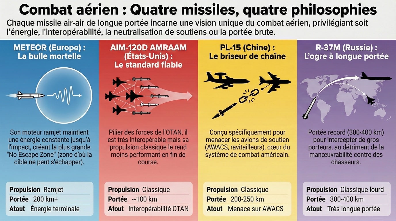 | METEOR | Europe (FR, UK, DE, IT, ES, SE) | Ramjet à flux variable | 200 km+ | No-Escape Zone largement supérieure | Rafale, Gripen, Typhoon, bientôt F-35 & KF-21 |